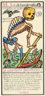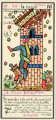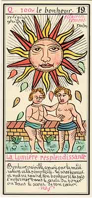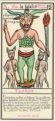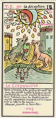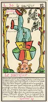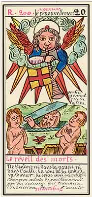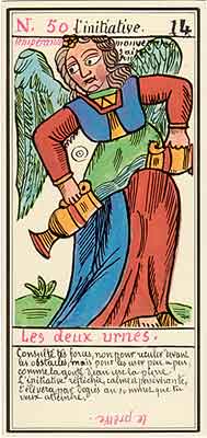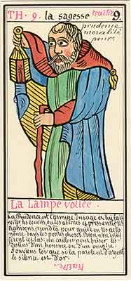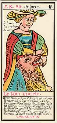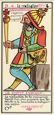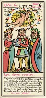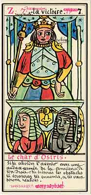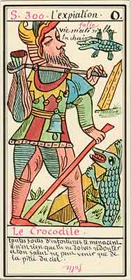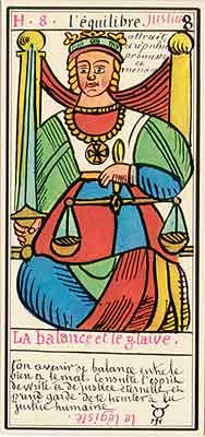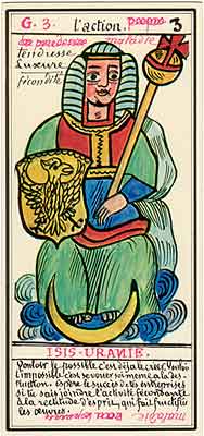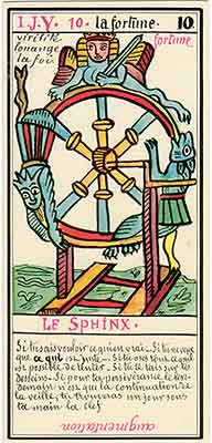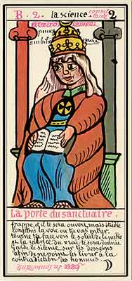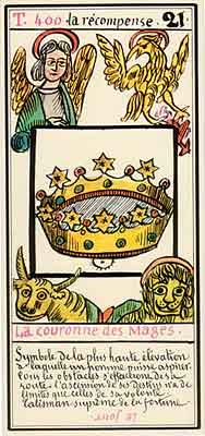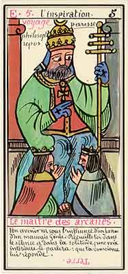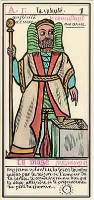 These Tarot cards descriptions are found in The Mysteries of the Pyramids, being the Book II in The History and Practice of Magic, by Paul Christian (1811-77). In fact, the word Tarot never appears in this text, and the images described are called Arcana and are actually frescoes in a legendary ancient underground temple in Egypt. The original French edition, Histoire de la magie, du monde surnaturel et de la fatalite' `a travers les temps et les peuples, was published in 1870. English text presented here was taken from a Kessinger reprint,The History and Practice of Magic, by Paul Christian. The original title page is missing in this reprint so the year this translation was first published is unknown to me. Decker, Depaulis and Dummett in A Wicked Pack of Cards tell us that 'an English translation was issued in 1952.' C. C. Zain in Sacred Tarot tells that the original French text was translated into English in 1901 'for private circulation' by Genevieve Stebbins. Fragments from this 1901 translation are included in Zain's book. In the English translation reprinted by Kessinger two paragraphs are missing. I have added them from Stebbins' translation. These two paragraphs are marked with dark red color. I don't have a French original, but in the Kessinger English reprint only one Arcanum, XXI The Crown of the Magi, is illustrated. This seems to be the only authentic Paul Christian's Tarot image. All other images accompanying Christian's descriptions herein are taken from the so called Grand Tarot Belline. These cards were drawn by Magus Edmond, or Edmond Billaudot (1829-81) probably between 1863 and 1870. The card titles used by Edmond (see A Wicked Pack of Cards for a detailed discussion) show that he actually illustrated Tarot images not from Histoire de la magie but from Christian's previous book, L'homme rouge des Tuileries (1863). This work, AFAIK, has never been translated into English; however the Tarot descriptions in both books are essentilally the same. The works by Paul Christian (fraudulent as they are often accused to be) inspired many later tarotists, including M. O. Wegener, Papus, "Comte de Saint-Germain", C. C. Zain and Woldemar von Uxkull, who all produced their own Tarot sets based to some degree upon Christian's descriptions. However, Grand Tarot Belline seems to be the only deck illustrating those descriptions faithfully, solely and exclusively. Many thanks to Jeannette and Lori of The Tarot Garden for providing a deck of Grand Tatot Belline for my collection. Card images (c) J.-M. Simon 1966 ![]() [Letter Athoim (A)--Number 1] THE MAGUS: Will A--1 expresses in the divine world the absolute Being who contains and from whom flows the infinity of all possible things: in the intellectual world, Unity, the principle and synthesis of numbers; the Will, principle of action: in the physical world, Man, the highest of all living creatures, called upon to raise himself, by a perpetual expansion of his faculties, into the concentric spheres of the Absolute. Arcanum 1 is represented by the Magus, the type of the perfect man, in full possession of his physical and moral faculties. He is represented standing upright, in the attitude of will proceeding to action. He wears a white robe, image of purity. His belt is a serpent biting its tail: the symbol of eternity. His forehead is enclosed in a fillet of gold, signifying light; this expresses the continuum in which all created things revolve. The Magus holds in his right hand a golden sceptre, image of command, raised towards the heavens in a gesture of aspiration towards knowledge, wisdom and power; the index finger of the left hand points to the ground, signifying that the mission of the perfect man is to reign over the material world. This double gesture means that human will ought to be the earthly reflection of the divine will, promoting good and preventing evil. Before the Magus on a cubic stone are placed a goblet, a sword and a shekel--a golden coin in whose centre a cross is engraved. The goblet signifies the mixture of passions contributing to happiness or misfortune, according to whether we are their masters or their slaves. The sword symbolises labour, the striving that overcomes obstacles and the tests that pain makes us undergo. The shekel is the image of aspirations fulfilled, works accomplished, the apex of power attained by perseverance and will-power. The cross, seal of the infinite with which the shekel is engraved, announces the future ascent of that power into the spheres of the future. Remember, then, son of earth, that man should, like God, act without ceasing. To will nothing and do nothing is more fatal than to will and do ill. If the Magus should appear in the prophetic signs of thy horoscope, it announces that a firm will and faith in yourself, guided by reason and a love of justice will conduct you to the end that you wish to attain and will preserve you from the perils of the way.** ![]() [Letter Beinthin (B)--Number 2] THE DOOR OF THE OCCULT SANCTUARY: Knowledge B--2 expresses, in the divine world, the consciousness of the absolute Being who embraces the three periods of all manifestations: the past, the present and the future. In the intellectual world, the Binary, reflection of Unity; Knowledge, perception of visible and invisible things: in the physical world, Woman, the matrix of Man, who joins herself with him in a similar destiny. Arcanum 2 is represented by a woman seated on the threshold of the temple of Isis, between two columns. The column on her right is red: this signifies purity of spirit. The column on her left is black, and represents the night of chaos, the impure spirit's captivity in the bonds of material things. The woman is crowned by a tiara surmounted by a crescent moon covered by a veil whose folds fall over her face. She wears on her breast the solar cross and carries on her knees an open book which she half-covers with her cloak. This symbolic figure personifies occult science w